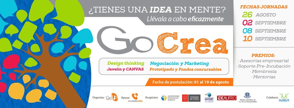 Un innovador programa de fomento al emprendimiento joven se encuentra desarrollando GoUp! Empresa Junior en conjunto con IncubatecUFRO y el auspicio del Núcleo de Ciencias Sociales y Humanidades de la Universidad de La Frontera. Se trata de GoCrea, un programa enfocado en el aprendizaje vivencial, donde los participantes –estudiantes de educación superior- trabajarán competitivamente en equipos.